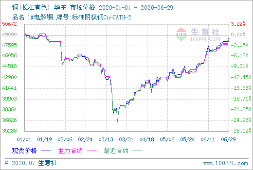 如上圖顯示,2020年上半年,銅市先下跌后上揚,走出“深V”走勢,據生意社數據監(jiān)測,年初銅價49033.33元/噸,隨后跌至半年最低點3月23日的36560元/噸,跌幅達25.44%,然后一路反彈至6月底的48166.67元/噸,幾乎完全收復之前跌幅,較年初只小幅下跌1.77%。