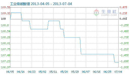 7月4日工業級碳酸鋰商品指數為107.19,與昨日持平,較周期內最高點112.10點(2012-11-04)下降了4.38%,較2012年01月05日最低點98.94點上漲了8.34%。(注:周期指2011-09-01至今) 工業級碳酸鋰商品指數