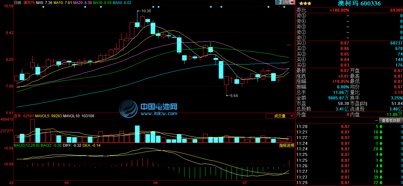 今日澳柯瑪開盤再度一字漲停,這已經是第二個一字漲停,股價報8.87元。