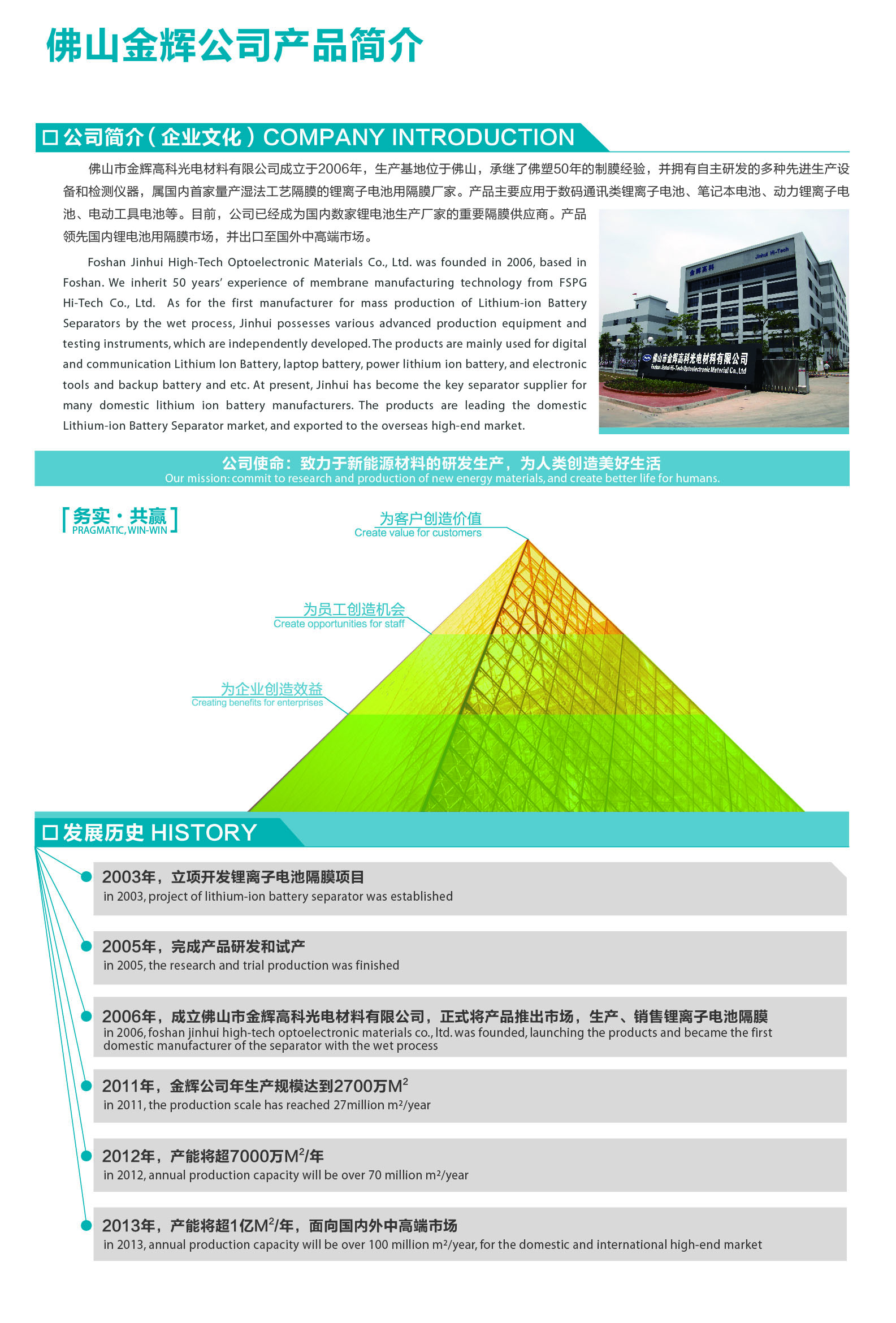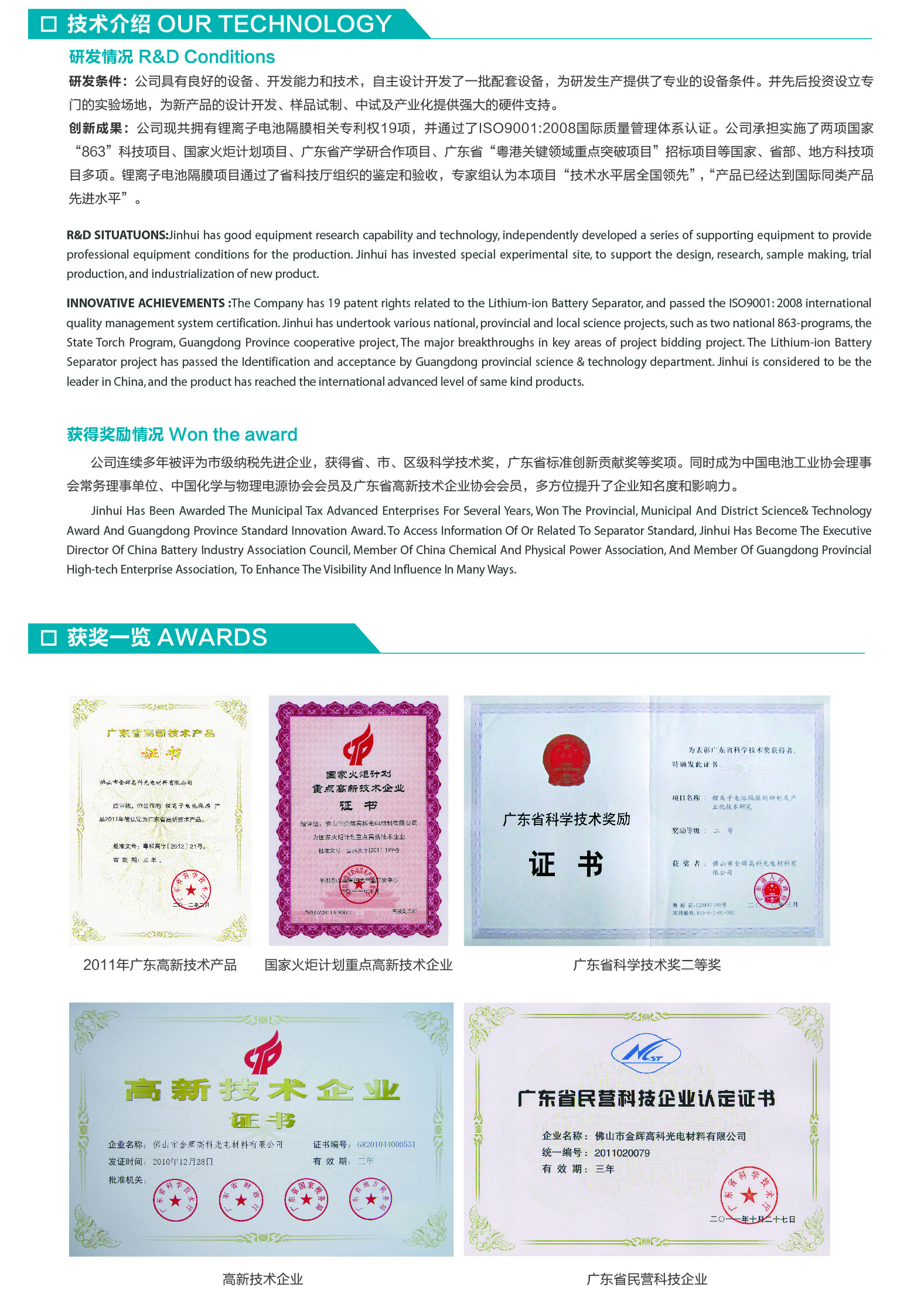 佛山市金輝高科光電材料有限公司(簡稱金輝公司)成立于2006年,目前注冊資本為921萬美元,是國內第一家使用濕法工藝生產鋰離子電池隔膜的廠家,國家火炬計劃重點高新技術企業,廣東省創新型企業試點單位。我司研制生產的鋰離子電池隔膜以質量穩定、性價比高等優勢蜚聲國內外市場,打破了長久以來國外產品的壟斷,填補了國內空白,工藝技術居國內領先地位,產品質量達到國際同類產品先進水平。