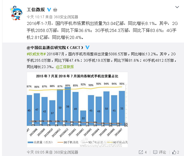 工信部官方微博@工信微報發(fā)布消息,2016年7月,國內(nèi)手機(jī)市場整體出貨量5086.5萬部,同比增長13.2%。其中,2G手機(jī)255.0萬部,同比下降47.4%;3G手機(jī)19.0萬部,同比下降81.6%;4G手機(jī)4812.5萬部,同比增長23.3%。