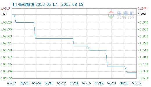 8月15日工業(yè)級(jí)碳酸鋰商品指數(shù)為105.99,與昨日持平,較周期內(nèi)最高點(diǎn)112.10點(diǎn)(2012-11-04)下降了5.45%,較2012年01月05日最低點(diǎn)98.94點(diǎn)上漲了7.13%。(注:周期指2011-09-01至今)