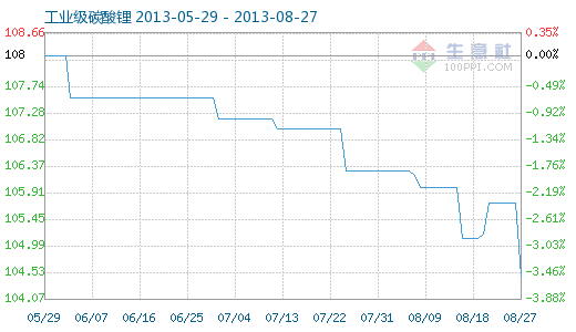 8月27日工業級碳酸鋰商品指數為104.46,較昨日下降了1.27點,較周期內最高點112.10點(2012-11-04)下降了6.82%,較2012年01月05日最低點98.94點上漲了5.58%。(注:周期指2011-09-01至今) 工業級碳酸鋰商品