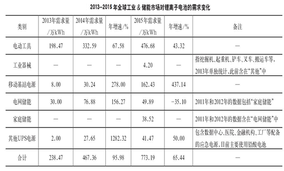 長期以來,電動工具市場上占據絕對壟斷地位的是鎳鎘電池,鋰離子電池、鎳氫電池、鉛酸電池等用量均不大,但隨著歐盟禁止銷售含有鎳鎘電池的無線電動工具的日期(2016年1月1日)日益臨近,以及鋰離子電池價格的快速下降,電動工具市場鋰離子電池的份額近 3年平均每年以 10%的速度在高速成長,到2013年已經接近50%的市場份額,首次超越鎳鎘電池而成為電動工具市場上用量最大的電池產品。在工業&儲能這個大市場中,電動工具這個細分市場的地位在迅速下 降 :2013-2015年的比例分別為83.23%、71.16%和 61.65%,主要原因是移動基站電源市場的快速崛起。移動基站主要分為宏站和微站,其中宏站主要是滿足2G和3G移動通訊的需要,使用的電源基本上都是鉛酸電池,近2年鋰離子電池價格的快速下降刺激了應用,但總體占比仍微不足道(以2015年中國市場為例,在200多萬座宏站中,使用鋰離子電池的不足1%);微站主要是滿足4G移動通訊發展需要的,主要建在樓宇間和人群密集處,狹小的空間使得能量密度最高的鋰離子電池幾乎成了唯一選擇,2015年僅中國 4G微站市場的需求量就超過了50萬k Wh。