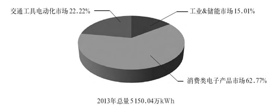 全球鋰離子電池市場消費結構這幾年正在發生顯著變化:市場重心正在由消費類電子產品向交通工具電動化、工業&儲能市場轉移。2013年有2 132.57萬k W h的鋰離子電池產品用于消費類電子產品市場,占比高達 80%以上,與此同時,交通工具電動化市場和工業&儲能市場對鋰離子電池的需求分別為292.54萬k Wh和 238.47萬k Wh,合計占比不足20%。