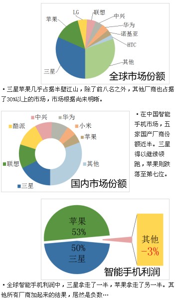 在手機硬件領域,三星和蘋果占據了半壁江山——這比手機平臺的局面要好很多。起碼,兩位領先者還給后來人留下了一半的市場空間。在全球手機市場,三星與蘋果分別占據31.7%和14.2%的市場空間,第3到8名一共占據了23.6%的份額——剩下的30%,有更多的長尾廠商瓜分。