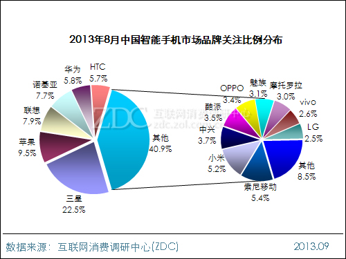 (圖) 2013年8月中國(guó)智能手機(jī)市場(chǎng)品牌關(guān)注比例分布