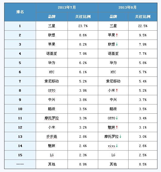 表 2013年7-8月中國(guó)智能手機(jī)市場(chǎng)品牌關(guān)注比例對(duì)比