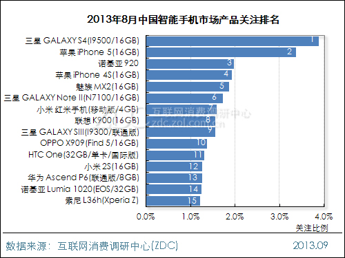 (圖) 2013年8月中國(guó)智能手機(jī)市場(chǎng)產(chǎn)品關(guān)注排名