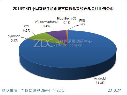 (圖) 2013年8月中國(guó)智能手機(jī)市場(chǎng)不同操作系統(tǒng)產(chǎn)品關(guān)注比例分布