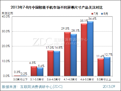(圖) 2013年7-8月中國(guó)智能手機(jī)市場(chǎng)不同屏幕尺寸產(chǎn)品關(guān)注對(duì)比