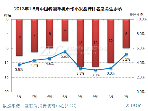 (圖) 2013年1-8月中國(guó)智能手機(jī)市場(chǎng)小米品牌排名及關(guān)注走勢(shì)