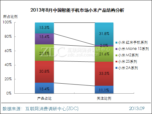 (圖) 2013年8月中國(guó)智能手機(jī)市場(chǎng)小米產(chǎn)品結(jié)構(gòu)分析
