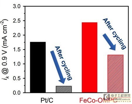 他們通過分析電壓變動量和電流密度發現:FeCo-OMPC催化劑表現出了超過鉑/碳催化劑的優秀的耐久性能和更好的抗失效性能。
