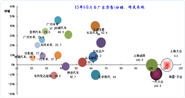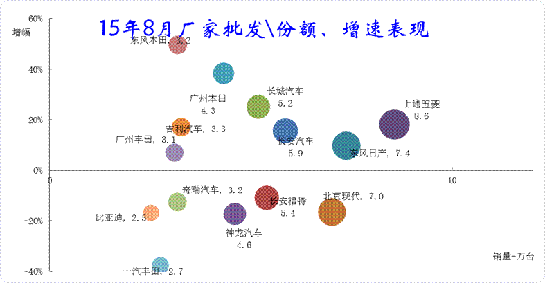15年8月的主力廠家表現與14年反差巨大,上海通用、一汽大眾、長安福特、神龍等前期表現較好的企業出現弱化趨勢。而豐田、本田出現異常的高增長現象,自主車企普遍表現較強。