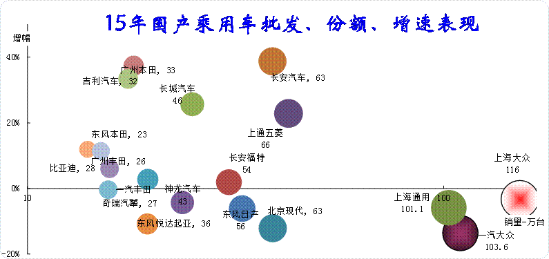 15年的廠家走勢分化,南北大眾和上海通用依舊是領軍。豐田已經逐步煥發活力,韓系和法系面臨調整。自主品牌的民營企業出現全面提升,長城、吉利、比亞迪都是表現較好。