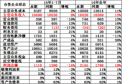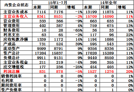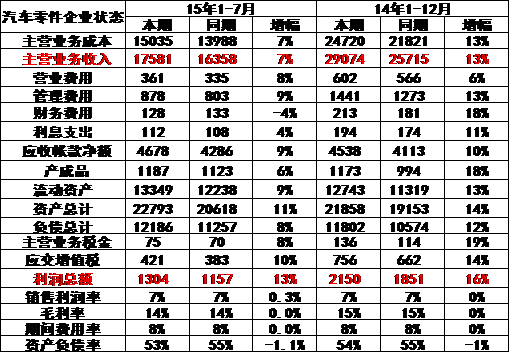 15年1-7月汽車零部件企業(yè)的收入和成本均增長(zhǎng)較好,利潤(rùn)同比增13%。其中的增值稅和主營(yíng)稅金均增長(zhǎng)較好。