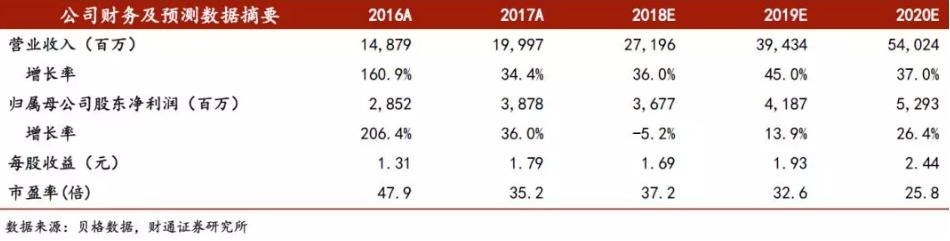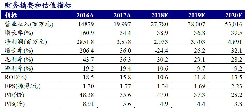 東興證券預計公司2018~2020年營業收入分別為326.83億元、440.36億元和609.63億元,歸母凈利潤分別為38.68億元、52.06億元和69.76億元,EPS分別為1.76元、2.37元和3.18元,對應PE分別為35.67倍、26.50倍和19.78倍。維持“強烈推薦”評級。