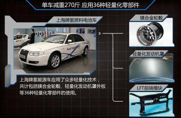 根據(jù)上汽十二五規(guī)劃,期間將投入60億人民幣進(jìn)行前沿技術(shù)的研發(fā),主要集中在新能源、車聯(lián)網(wǎng)和車輛輕量化三大前沿技術(shù)。此次所展出的上海牌氫能源車便應(yīng)用了眾多輕量化技術(shù),包括鎂合金輪轂、輕量化發(fā)動(dòng)機(jī)罩外板等36種輕量化零部件的使用,令其整備質(zhì)量實(shí)現(xiàn)大幅削減,這也使得該車的續(xù)航里程及整車性能有了大幅提升。依托燃料電池組驅(qū)動(dòng)的上海牌轎車,氫是燃料電池的主要能源,動(dòng)力蓄電池作為輔助動(dòng)力,成為上汽獨(dú)立開發(fā)的新一代燃料電池轎車。
