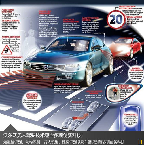 沃爾沃即將在2014年推出的可全自動(dòng)駕駛的汽車,裝備了沃爾沃開發(fā)的全新交通堵塞輔助系統(tǒng),目前已有實(shí)車在測(cè)試中。這個(gè)系統(tǒng)可以讓汽車以50km/h以下的速度自動(dòng)跟隨前方車輛行駛。