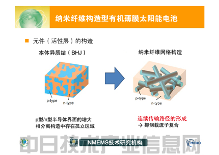 此次的有機(jī)薄膜太陽(yáng)能電池采用了p型半導(dǎo)體與n型半導(dǎo)體的接觸面積大、可提高發(fā)電效率的本體異質(zhì)結(jié)。而且采用了使p型半導(dǎo)體變成納米級(jí)微細(xì)纖維狀、在其他部分填充了n型半導(dǎo)體的結(jié)構(gòu)(圖3)。