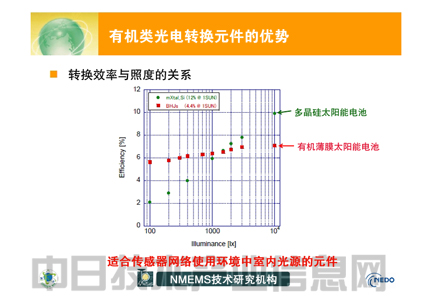 采用有機(jī)半導(dǎo)體的太陽(yáng)能電池的發(fā)電效率已達(dá)到并不遜色于住宅及工業(yè)使用的非晶(多晶)硅型太陽(yáng)能電池的水平。在目前已公開(kāi)的產(chǎn)品中,有機(jī)半導(dǎo)體太陽(yáng)能電池最高水平的效率為12%。在室內(nèi)低于1000lux的照度條件下,其效率高于非晶硅太陽(yáng)能電池等(圖2)。在室內(nèi)環(huán)境中,有機(jī)薄膜太陽(yáng)能電池在效率方面也十分有利。