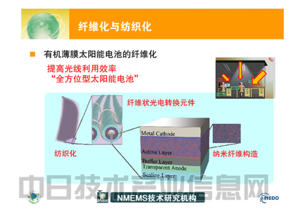為了實(shí)現(xiàn)在昏暗的室內(nèi)也能高效發(fā)電、成本僅為1000日元的“粘貼型傳感器”,柔性太陽(yáng)能電池的開(kāi)發(fā)正在進(jìn)行之中。將把采用可降低成本的有機(jī)半導(dǎo)體制造的薄膜太陽(yáng)能電池制成nm(10-9m)級(jí)微細(xì)纖維狀,再編織成“布”。計(jì)劃將這種太陽(yáng)能電池用于植物工廠。日本NMEMS技術(shù)研究機(jī)構(gòu)綠色傳感器網(wǎng)絡(luò)研究所大岡山研究中心主任谷岡明彥以《傳感器網(wǎng)絡(luò)系統(tǒng)中納米纖維獨(dú)立電源的開(kāi)發(fā)》為題發(fā)表演講,介紹了這種太陽(yáng)能電池的開(kāi)發(fā)詳情。