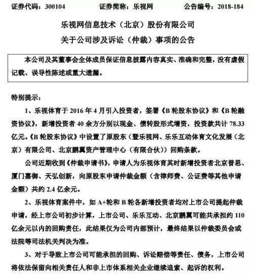 樂視網表示,樂視體育案件中,A+輪和B輪各新增投資者均對上市公司提起仲裁申請,經上市公司初步計算,樂視網、樂樂互動、北京鵬翼可能共承擔約110億余元以內的回購責任,此結果僅為公司內部預計,最終結果以仲裁委員會或法院等司法機關判決為準。