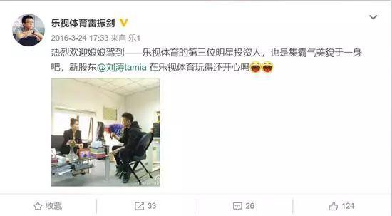 2016年樂視體育資金緊張時,演員劉濤爽快地投入5000萬元。