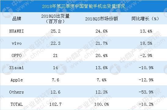 這一數(shù)據(jù)和全球IDC公司的最新數(shù)據(jù)相吻合。IDC公司的統(tǒng)計顯示,2018 年第三季度全球智能手機出貨 3.552 億臺,同比下降 6%,連續(xù)四個季度下滑,我國智能手機出貨 1.027 億臺,同比下降 10.02%,連續(xù)六個季度下滑。