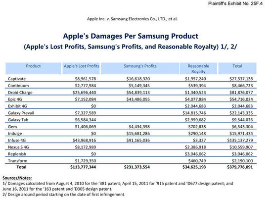 在提交給陪審團的三星侵權產品圖表中,蘋果著重指出了兩款銷售額最高的手機設備,包括Infuse4G(累計銷售額1.35億美元)和Droid Charge(8100萬美元),這兩款手機目前已經在美國地區(qū)下市。