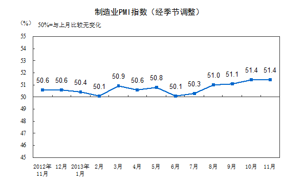 2013年11月,中國制造業采購經理指數(PMI)為51.4%,與上月持平,為2012年5月以來的高點,連續14個月位于臨界點以上,表明我國制造業繼續穩中向好。