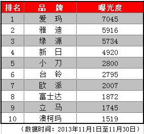 2013年11月份《電動自行車行業品牌網絡營銷口碑指數榜》數據于12月上旬正式發布。此次口碑榜是對各品牌11月份媒體曝光度、用戶關注度、產品關注度,以及標題浮現率等相關數據的綜合統計,并對各品牌在行業內的口碑及各自影響力的變化進行了動態評估。