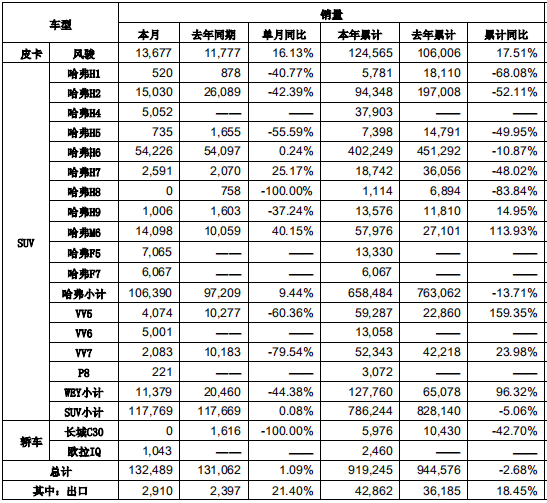 據長城汽車發布的數據顯示,長城11月銷售新車132489輛,同比去年增長了1.09%,環比增長20.35%;前11個月累計銷量達到91.92萬輛,今年的整體銷量突破百萬已無懸念。