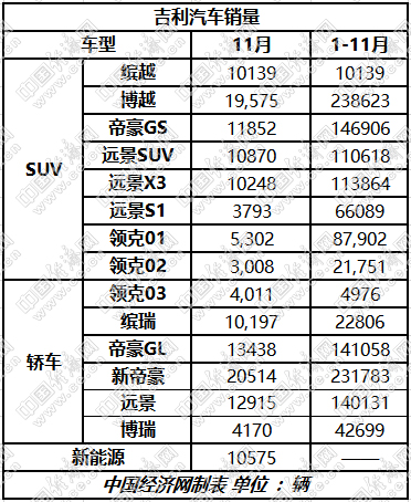 相比之下,勢(shì)頭強(qiáng)勁的吉利汽車,在公布數(shù)據(jù)上則事無巨細(xì)。官方數(shù)據(jù)顯示,吉利汽車在11月份的銷量(含領(lǐng)克品牌汽車銷量)為141661輛,同比增長(zhǎng)0.3%;前11個(gè)月銷量達(dá)到1407505輛,較去年同期增長(zhǎng)29%,約完成其全年158萬輛銷量目標(biāo)的89%。