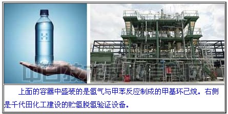 過去,氫氣無法在常溫常壓下裝入塑料容器運輸。而千代田化工開發的“有機化學氫化物法”能夠使氫氣與甲苯發生反應,生成“甲基環己烷”(MCH)液體。從甲基環己烷中分離氫氣雖然一直是個難題,但借助自主開發的催化反應技術,千代田化工取得了成功。