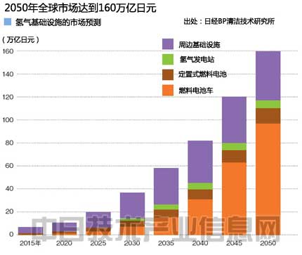 剛剛在10月發行了《世界氫氣基礎設施項目總覽》的日經BP清潔技術研究所稱,到2015年,世界氫氣相關市場規模約為7萬億日元。之后,燃料電池車與定置燃料電池將帶動市場擴大,市場規模將在2020年超過10萬億日元,到2030年將達到約37萬億日元。到那時,各國的發電企業都將積極投資氫氣發電,投入運營。2050年的市場規模預期高達160萬億日元。