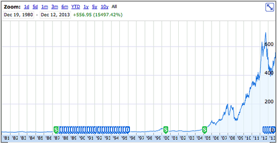 隨著上市而獲得融資,蘋果開發了Lisa和Macintosh。1980年代的10年期間,蘋果在進行季度派息的同時其股價增長了199%。