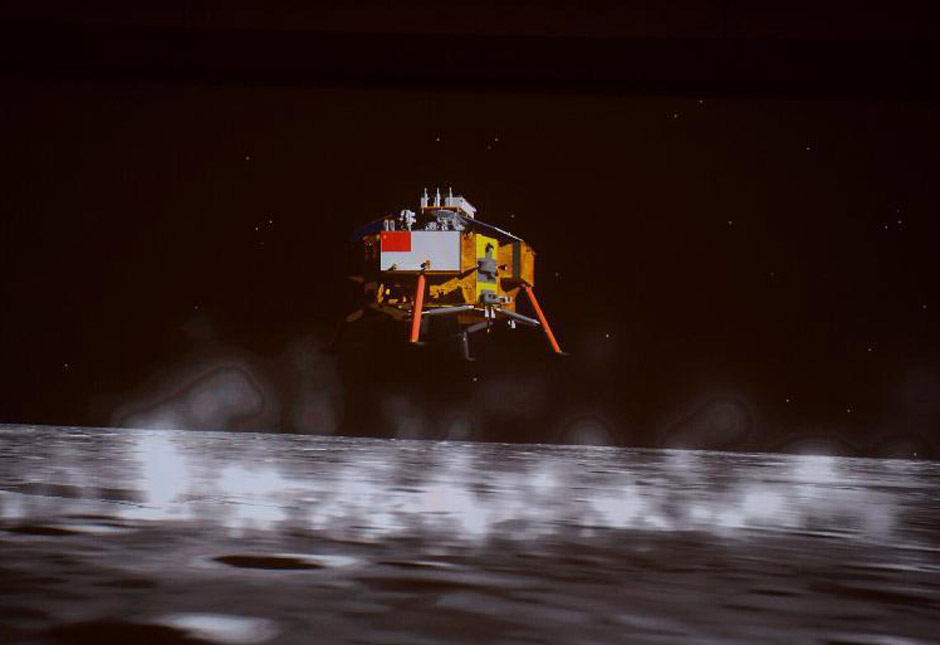 從15公里高度開始的。大約12分鐘的落月過程中,嫦娥三號依靠自主控制,經過了主減速段、快速調整段、接近段、懸停段、避障段、緩速段等6個階段,相對速度從每秒1.7公里逐漸減為0。在距離月面100米高度時,探測器暫時停下腳步,利用敏感器對著陸區進行觀測,以避開障礙物、選擇著陸點。在以自由落體方式走完最后幾米之后,平穩“站”上月面的4條著陸腿觸月信號顯示,嫦娥三號完美著陸月球虹灣地區。