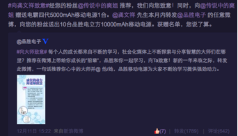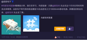 在不到10分鐘內,@新張利 正式介入,開始參與互動,該活動開始升溫,后續包括@真老頑童、@胡掌門、@龔文祥等知名微博人士,以及一批網絡認證的企業、營銷圈用戶開始介入,繼續發 酵。事實證明品勝這一招是拉動大V尤其是在網絡營銷領域最為活躍的群體帶動他們的粉絲一起互動來傳播品勝移動電源,至少超出其自身發布活動的粉絲活躍度及 曝光度2倍以上。接著半小時后又相繼拋出“向杜子建致意”、“向羅永浩致意”的微博得到網友的互動。