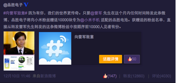 在小米電源12點發售前的11:46,@品勝電子 又拋出一條微博,向小米CEO雷軍“致意”,拿出10000塊小米電池向雷軍隔空喊話,只要雷軍轉發這條微博,其粉絲再做轉發,前面10000個 小米粉絲即可無條件每人直接獲得一塊小米電池,無任何門檻。正是這一微博催熱了小米粉絲對此活動的瘋狂轉發熱情,呼喊雷軍來轉發的聲音連綿不絕,更引發了 普通網友、媒體以及整個互聯網、電商、移動電源業界的普遍關注,成為當天熱門網絡事件。通過當天接連不斷的持續網友自發轉發發酵,事件達到了相當高的熱 度。有業內人士當天下午在微博上指出,不論雷軍轉與不轉,@品勝電子 的傳播目的均已達到,這一戰打得漂亮!