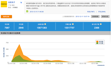 然而,產品發布之日,其宣傳攻勢卻被@品勝電子 突入其來的營銷舉措巧妙借勢,為@品勝電子 做了嫁衣裳,且多少亂了其既定的計劃!作為一向低調行事的國內移動電源老大,品勝到底是如何一鳴驚人,扼住了小米網絡營銷攻勢的咽喉呢?請各位與筆者一同 走進這場堪稱2013年末經典的微博之戰。