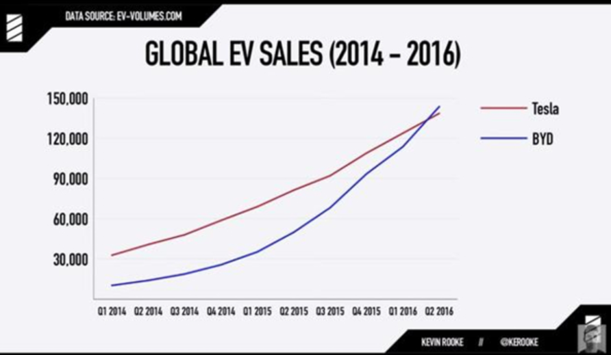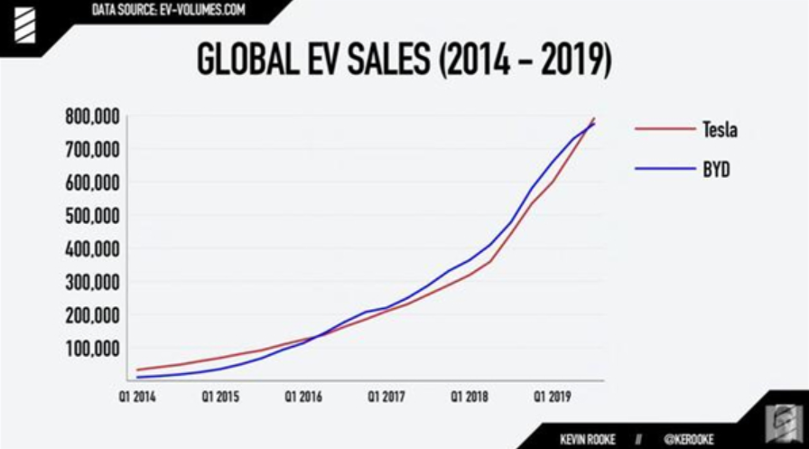 根據(jù)Kevin Rooke的統(tǒng)計(jì),與比亞迪同樣成立于2003年的特斯拉,在2016年前,銷量一直都在比亞迪之上,直到2016年1月左右,比亞迪整體銷量才超過了特斯拉,并在長達(dá)三年的時(shí)間里始終保持全球新能源汽車銷量第一。但隨著 Model 3 產(chǎn)能的釋放,截至今年10月,特斯拉再次實(shí)現(xiàn)了反超。