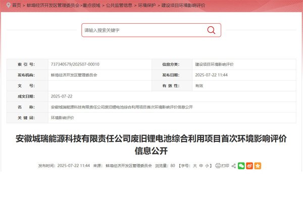 安徽城瑞能源科技有限責(zé)任公司廢舊鋰電池綜合利用項目建設(shè)地點(diǎn)為蚌埠市經(jīng)開區(qū)智能制造產(chǎn)業(yè)園 ... 查閱全文