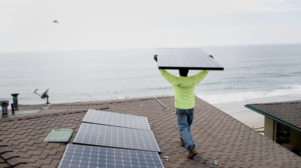 安裝工在加利福尼亞州的家庭項目中搬運太陽能電池板