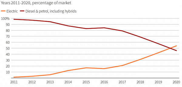 挪威成為全球首個純電動車銷量超內燃機車的國家 市場份額達54.3%