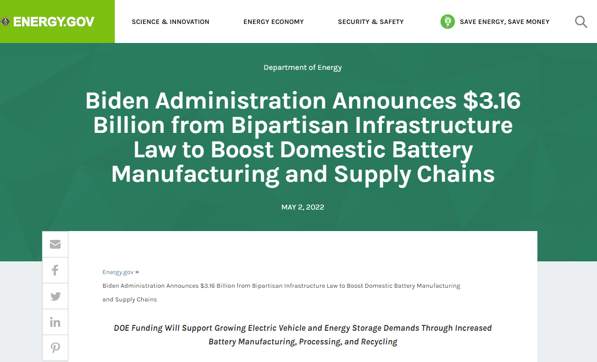 美國能源部啟動31.6億美元計劃 著力提升本土電池供應鏈水平