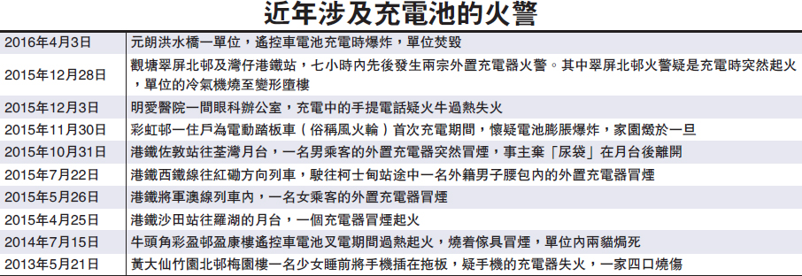 本港昨日發生兩宗疑涉及鋰電池的火警,幸火警中未有造成傷亡。元朗洪水橋一個住宅單位,戶主疑為一輛遙控車使用的鋰電池充電期間,電池突然爆炸,迅即著火焚燒,火勢一發不可收拾,全屋迅陷火海。屋內一名15歲女住客幸及時逃生,火警雖無人受傷,但少女已飽受驚嚇,全屋亦嚴重熏黑。另一宗火警則發生在機場貨運站,一個載有鋰電池包裹“自焚”,消防員到場將火警撲滅。