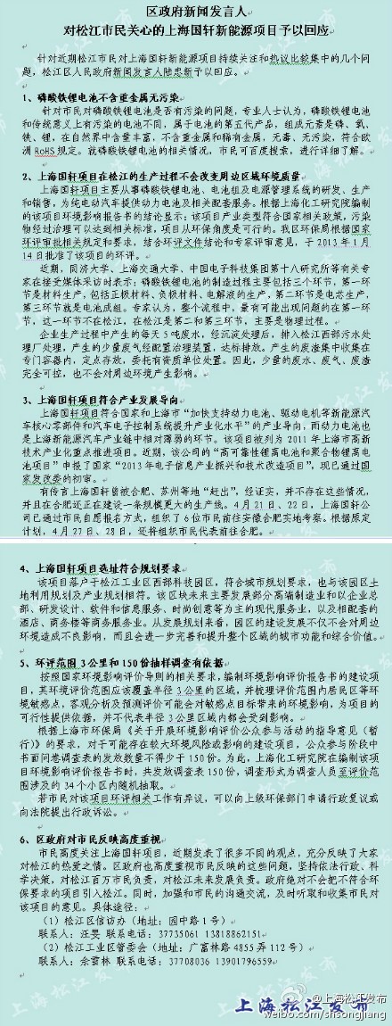 圖說:松江區(qū)政府關于國軒新能源項目的回應微博。