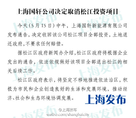 【本網訊 】 據“上海發布”新浪官方微博消息,上海國軒新能源有限公司發布通告,決定收回該公司松江項目全部投資,土地退還政府,不要求任何賠償。上海市松江區政府表示,將根據企業